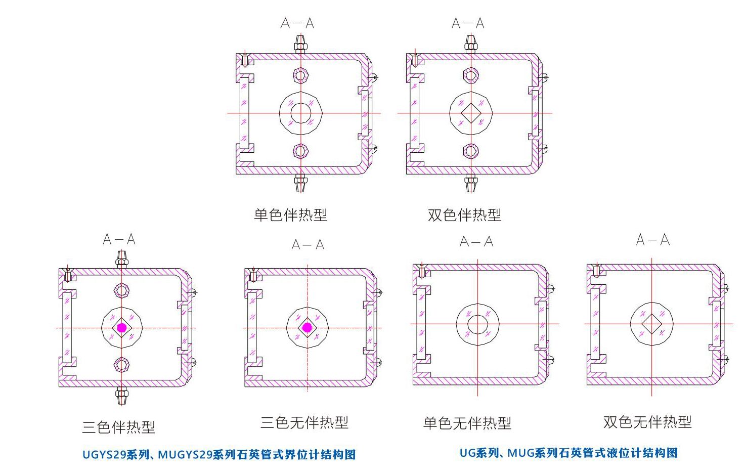 該系列產(chǎn)品按顯示效果分為單色和雙色和三色(測界位),單色顯示介質(zhì)本色;雙色則顯示汽紅液綠,液位顯示對比分明,觀測清晰;三色用于測量兩種介質(zhì)的界位,密度大的介質(zhì)顯示綠色,密度小的介質(zhì)顯示紅色,在液-液分界面上有一黑色浮子,界位顯示清晰直觀。